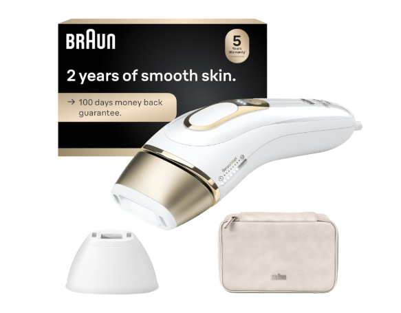 Discover Braun’s at-home laser IPL device for safe and effective hair removal. Achieve 95% hair reduction in 1 month³, and enjoy 2 years free of hair and hair removal¹. Dermatologically and gynecologically approved, it’s eye-safe—no protective glasses required. Invest once, skip the salon, and save thousands. Each flash automatically adapts to your skin tone, optimizing the power for the perfect balance between fast results and gentleness on skin. 2 sensitive modes ensure your skin’s comfort.Skip the salon, save thousands and get long lasting smooth skin from the convenience of your home. Box includes: 1 × Silk·expert Pro 5 with standard head 1 × Additional wide head 2 × Additional precision heads 1 × Venus Extra Smooth Swirl razor 1 × Vanity case